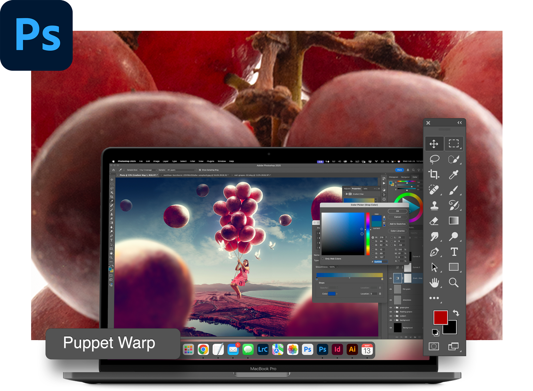 Step into the world of creative storytelling and discover how Photoshop can transform your ideas into fully realized works of art. In The Grape Escape, you’ll master the techniques of compositing while bringing to life a whimsical scene filled with floating grape balloons, soft skies, and playful details.