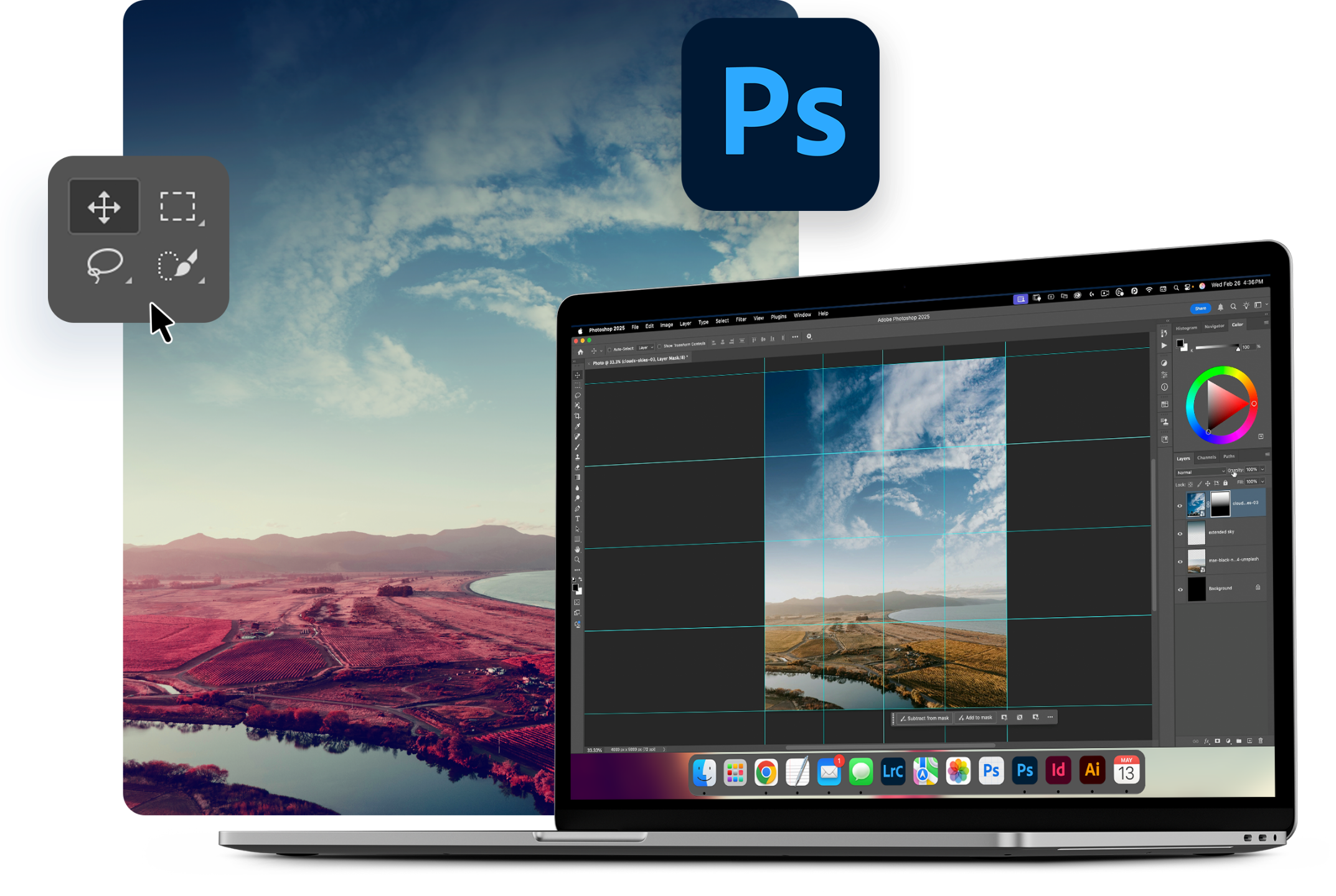 With Photoshop ready to go, it’s time to build the foundation of your composite. You’ll create the background, extend the sky, and start blending elements together — all while learning essential techniques like masking, gradients, and adjustment layers to make everything fit seamlessly.