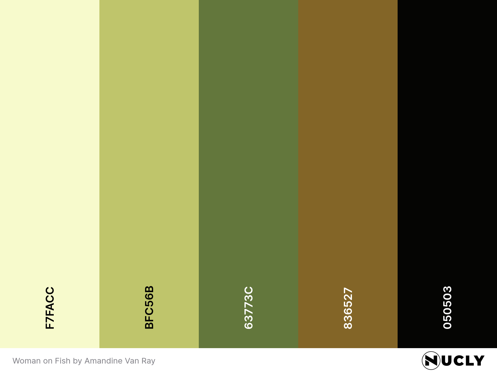 Amandine Van Ray builds this piece around a soft yellow base that washes over almost everything. The fish, the sky, even the distant city all sit inside that range. It’s flanked by a muted brown on one side and a desaturated green in the dress on the other, keeping the palette tight and controlled without feeling flat.