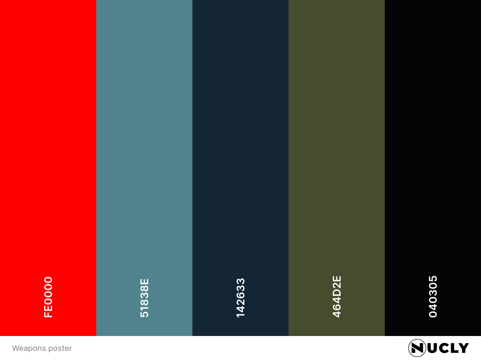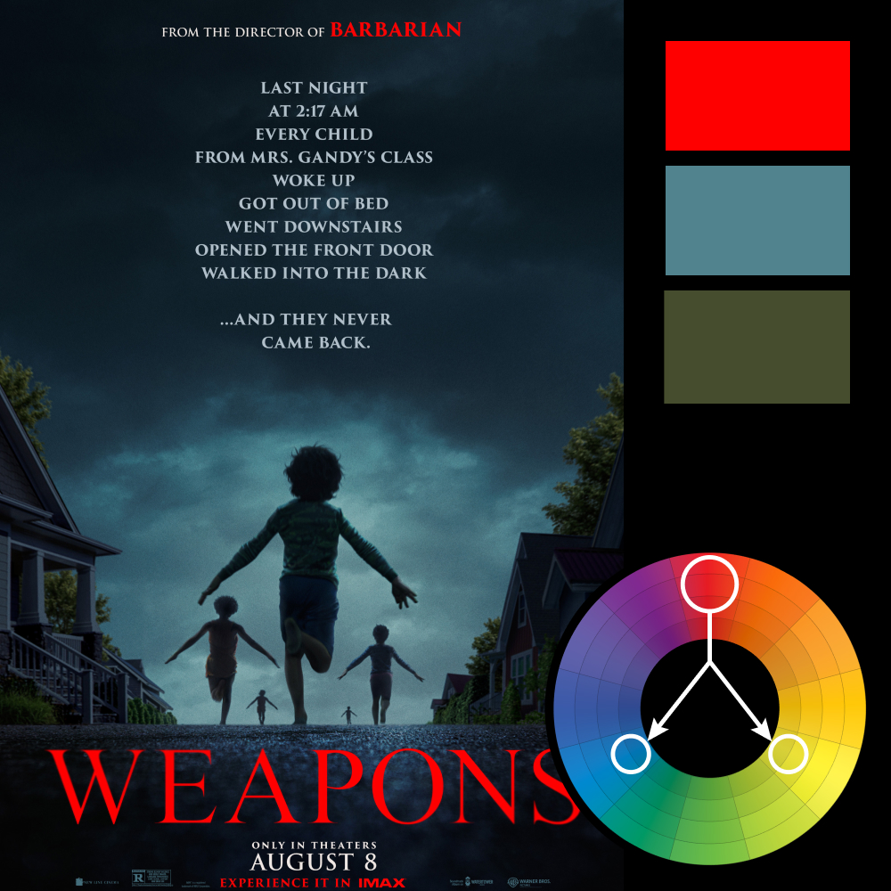 A restrained triad drives this poster: a saturated red used sparingly, surrounded by desaturated blue and a muddy yellow-green that separates the trees from the sky.