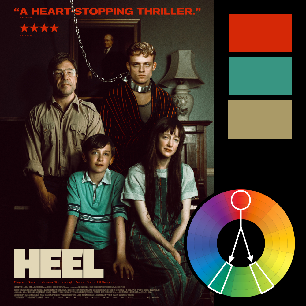 This week’s featured artwork is the poster for Heel, which uses a split complementary harmony with red as the anchor—most notably in the review blurb and the bathrobe stripes of the central character. The supporting hues are a muted aqua and a washed-out olive that feels lifted straight from a sun-faded 1970s family photo.