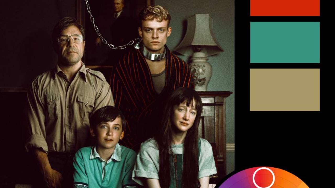 That’s no accident. The entire composition plays on the trope of awkward posed portraits, with a “happy family” arrangement that slowly collapses under closer inspection. The chain. The collar. The expressionless faces. The contrast between palette and content creates exactly the kind of quiet unease the poster wants you to sit with. It’s not screaming horror—but something’s off, and you’re meant to notice.