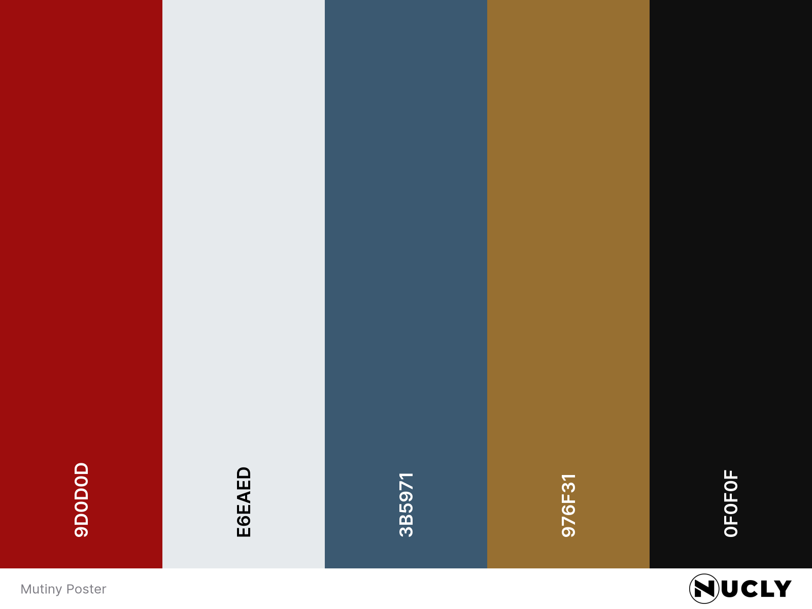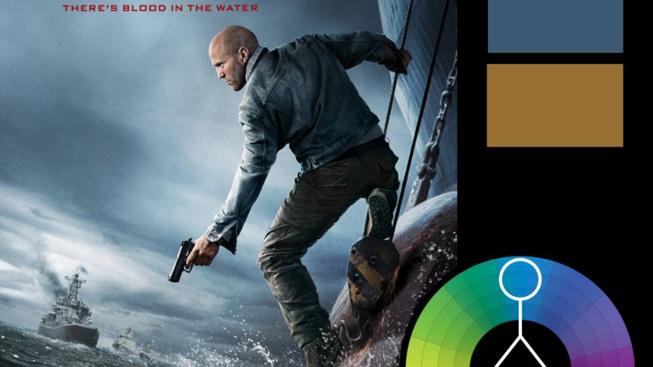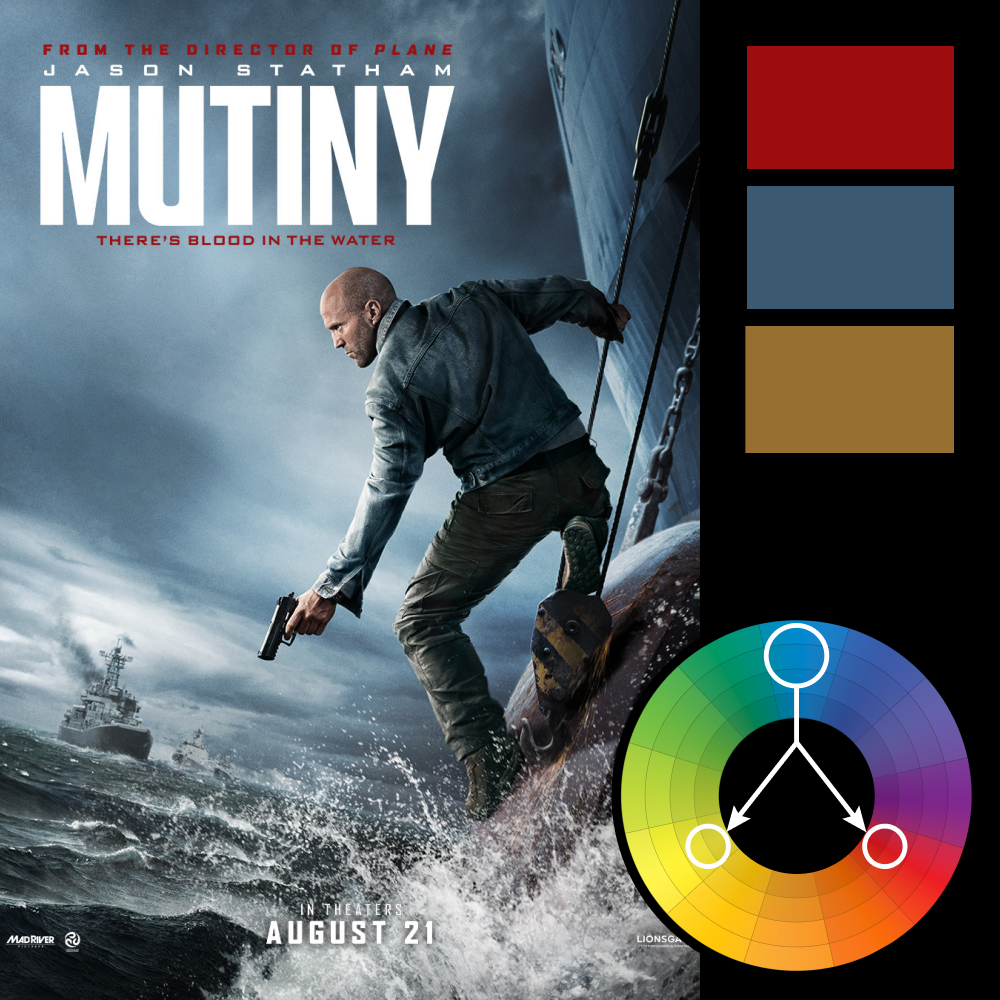The Mutiny poster is a textbook example of restrained triadic color harmony. Blue dominates nearly the entire frame—storm clouds, ocean, and wardrobe—pushing the palette into a cold, desaturated range. The other two triadic colors show up only as accents: the red in the title and the yellow paint on the hook Jason Statham is stepping off. Small touches, but they carry a lot of visual weight against that wall of blue.