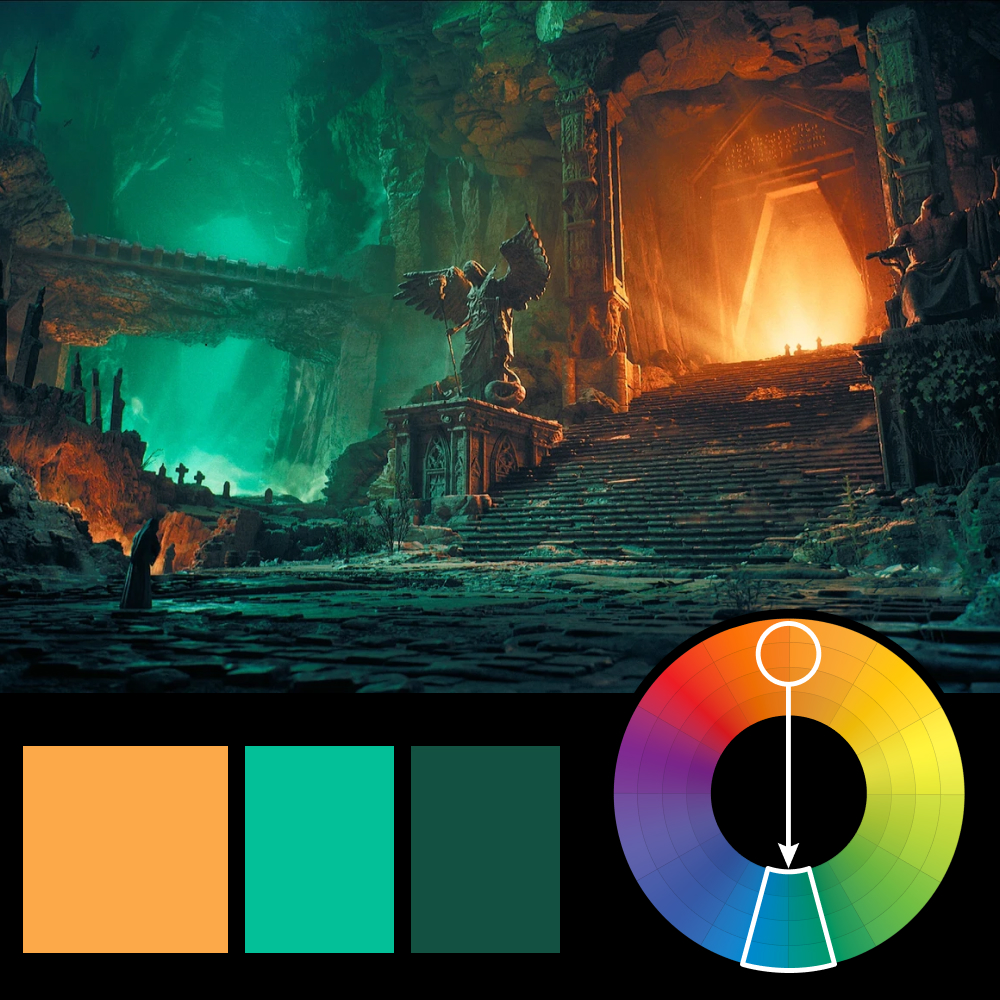 That intense contrast is balanced by a large amount of cool hues, allowing the warmth to feel focused and intentional. This is a perfect example of how color harmony can serve both narrative and design: the orange tells us something powerful, something otherworldly is beyond the door, while the teal keeps the composition grounded in shadow and mystery.