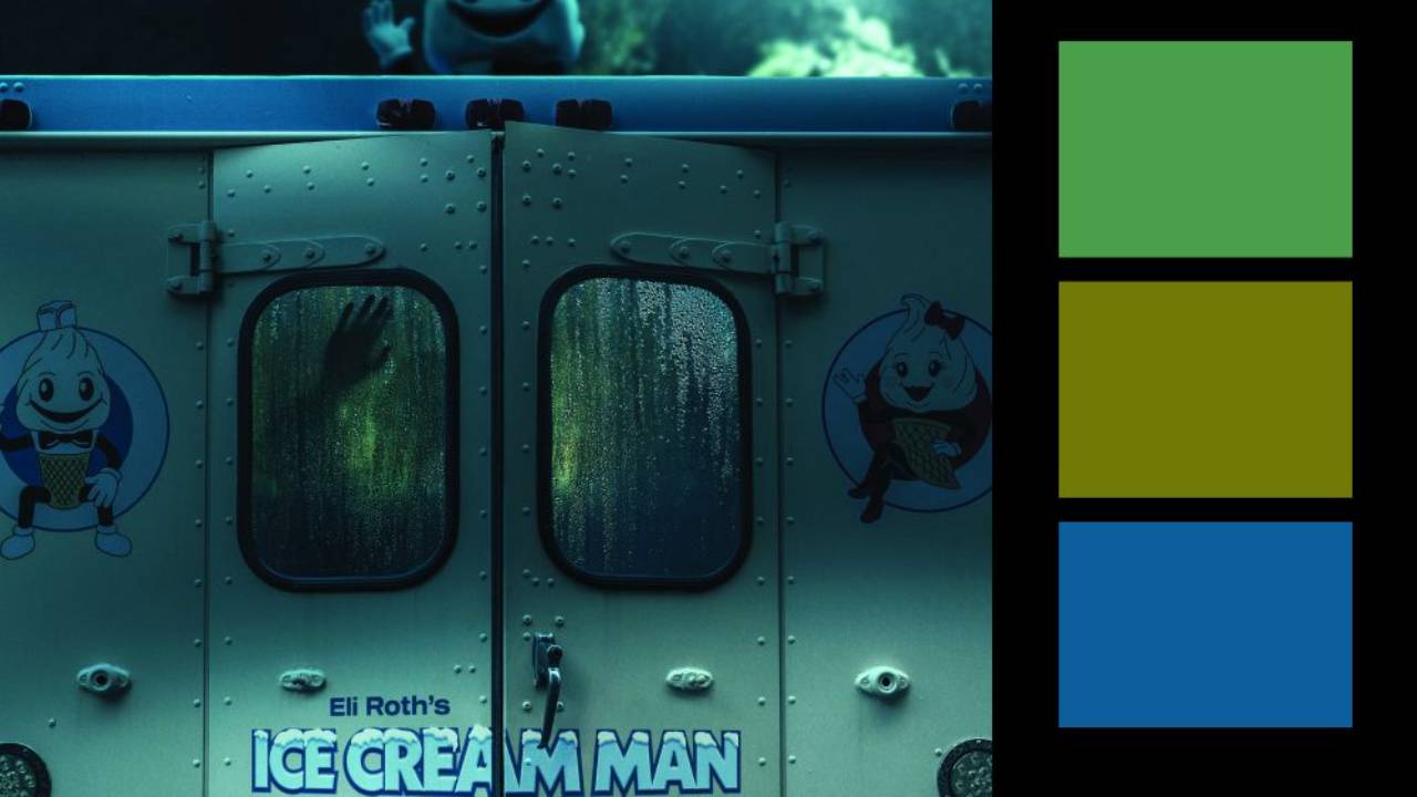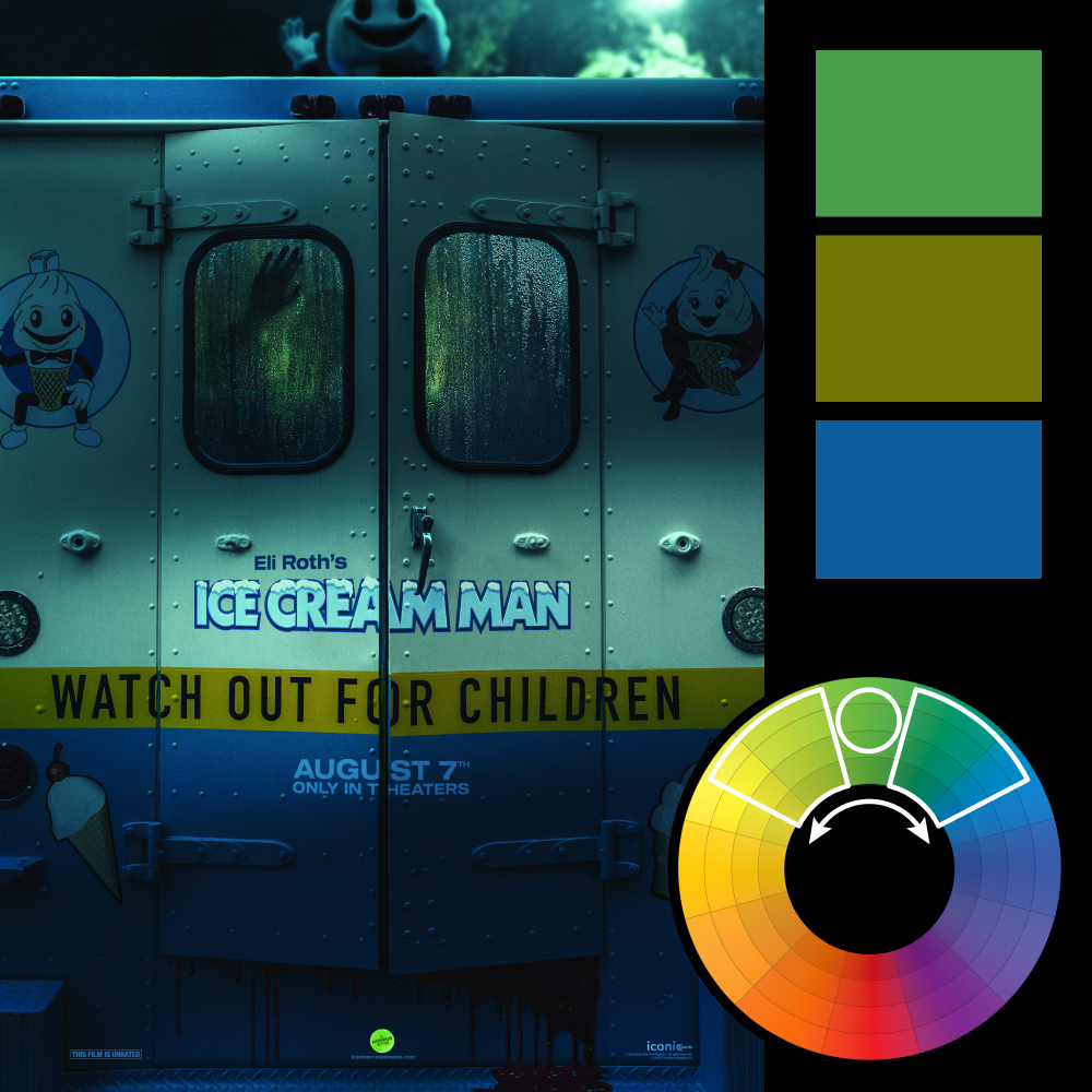 At first glance, this poster looks like a simple blue and gold pairing. But the heavy color grade pushes both ends of the palette toward green. The yellow tape shifts toward chartreuse. The truck and shadows lean teal. What should be a complementary setup ends up sitting inside a tight analogous range instead.