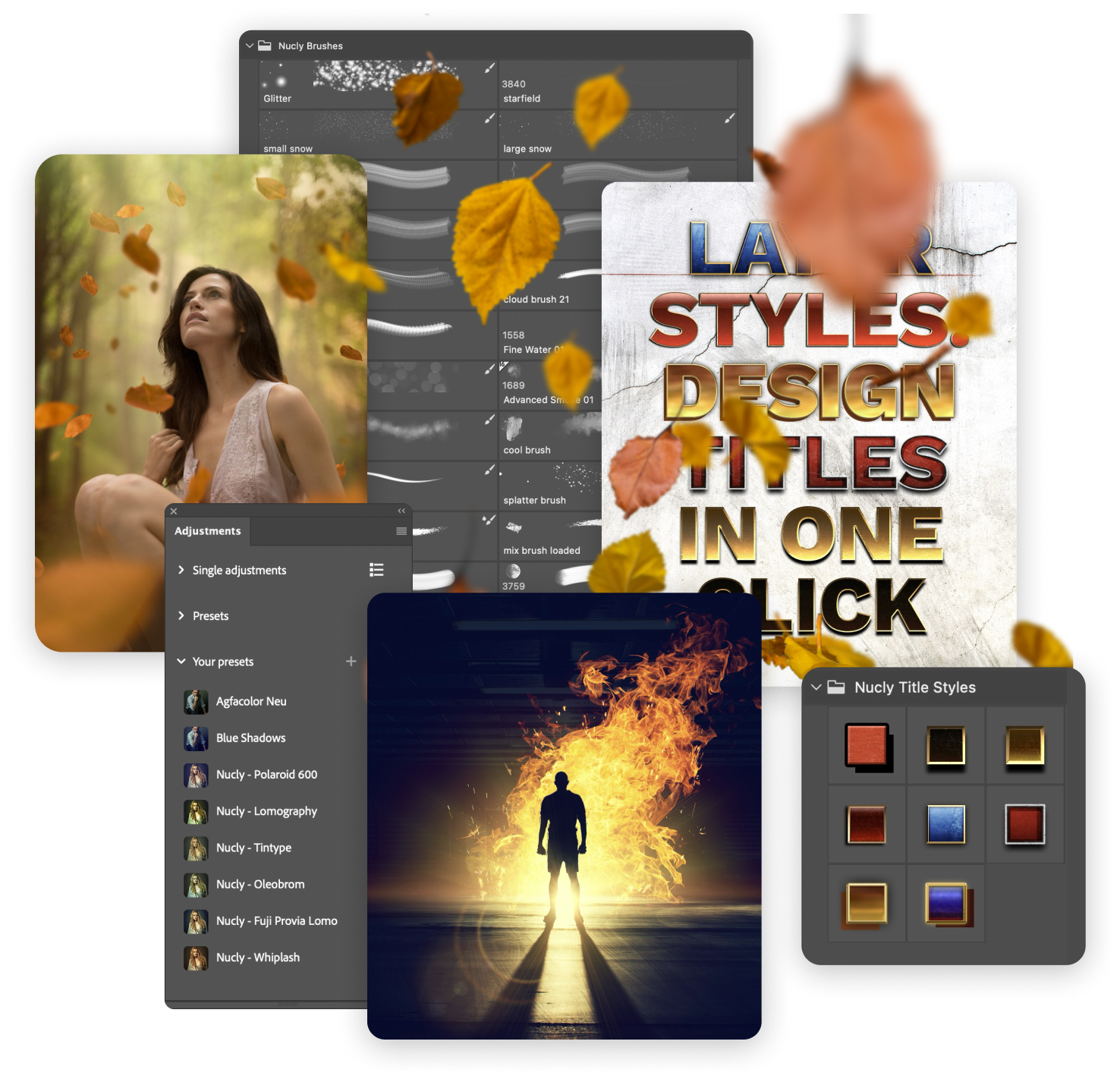 Light overlays, lens flares, particles, textures, and foreground elements to help you create depth, mood, and story-driven images. - 60 Favorite Brush Presets